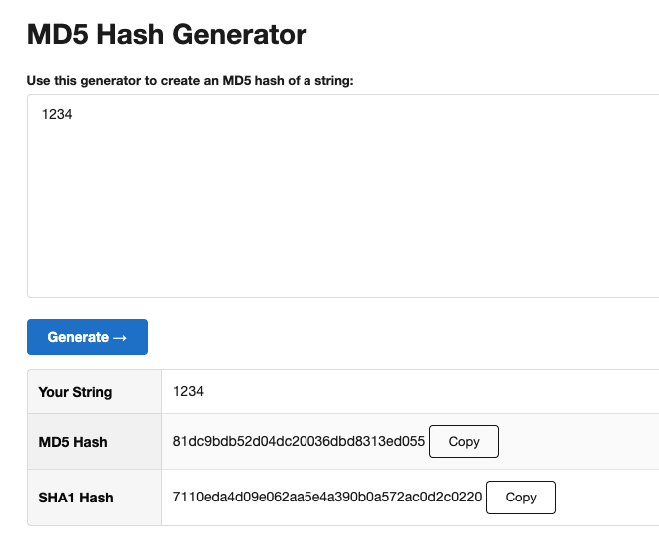 “1234” -> 81dc9bdb52d04dc20036dbd8313ed055